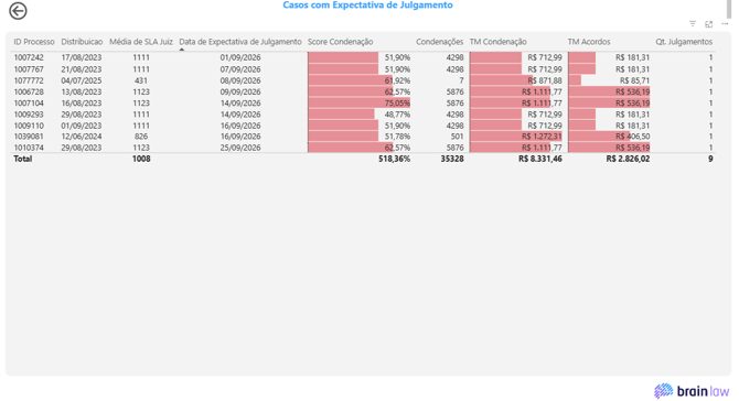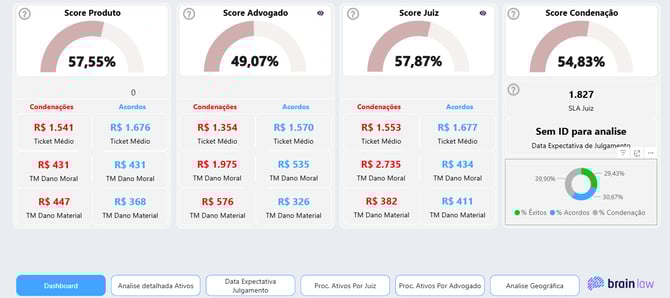A tela inicial mostra dados consolidados de score de condenação. Caso filtre pelo ID do processo, os dados irão refletir o histórico de processos semelhantes.