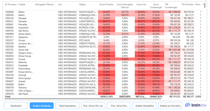 A Análise Detalhada mostra informações importantes como Scores de Condenação, Tickets médios e processos com maior tempo ativo.