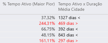 Processos com "% Tempo Ativo" menor que 100% estão de acordo com o tempo médio de encerramento daquela cidade do processo.