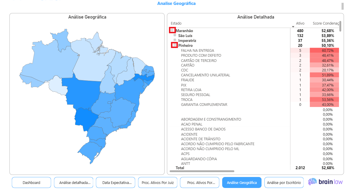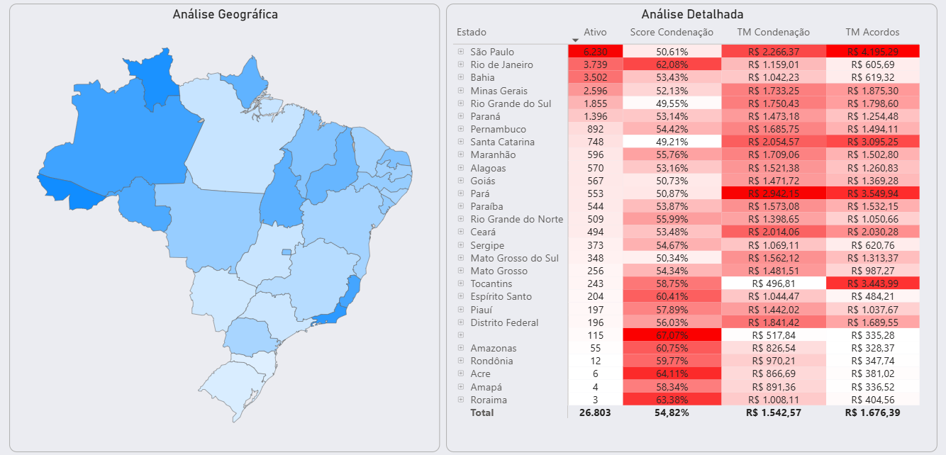 A análise geográfica possibilita detalhamento de scores e tickets médios de acordo e condenação por estado, cidade e assunto, basta clicar no '+' para expandir.