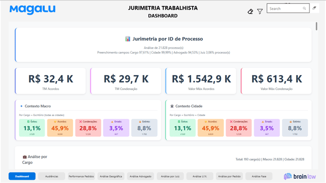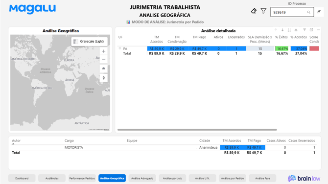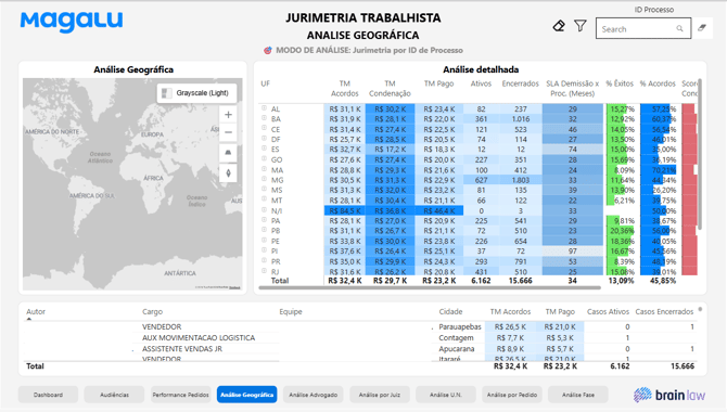 A análise geográfica permite visualizar tickets médios de acordos, condenações e valores pagos, além da quantidade de processos ativos e encerrados por estado, cidade e unidade de negócio. Também são apresentados indicadores de SLA entre a demissão e a inclusão do processo, bem como a performance geral dos resultados.