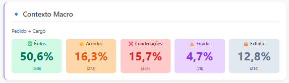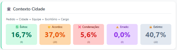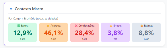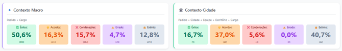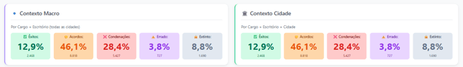 Logo abaixo dos cards principais, o dashboard apresenta duas análises lado a lado. O Contexto Macro exibe os resultados agrupados por cargo e escritório, permitindo uma visão mais ampla e estratégica do desempenho dos processos. Já o Contexto Cidade aprofunda a análise ao considerar também a cidade onde o processo foi iniciado, oferecendo uma leitura mais detalhada e regionalizada dos resultados.