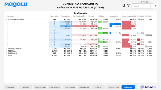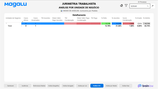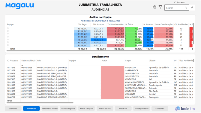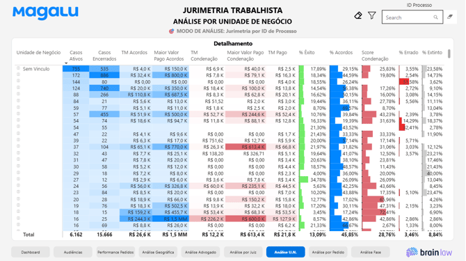 Essa visão apresenta o desempenho trabalhista de cada unidade de negócio, permitindo identificar unidades com maior risco, maior volume de processos e piores resultados defensivos. A análise apoia a priorização de auditorias, treinamentos e alocação de recursos jurídicos e de RH.