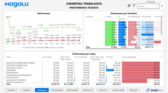 A tela de Performance de Pedidos mostra o desempenho em relação a tipos específicos de pedidos trabalhistas. Os indicadores apresentam percentuais de êxito, condenação e o Score de Condenação, que indica o nível de risco associado a cada tipo de pedido. Quanto maior o score, maior a prioridade de atuação preventiva e corretiva.