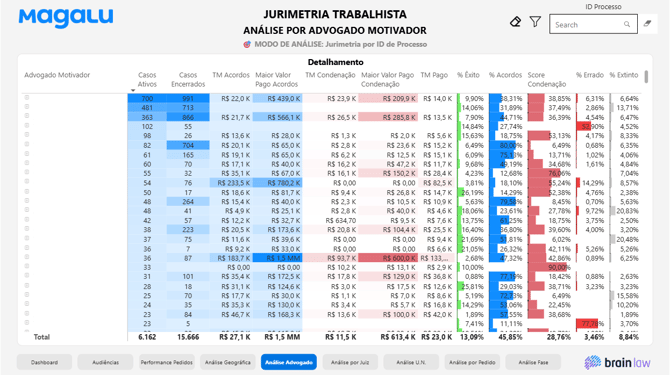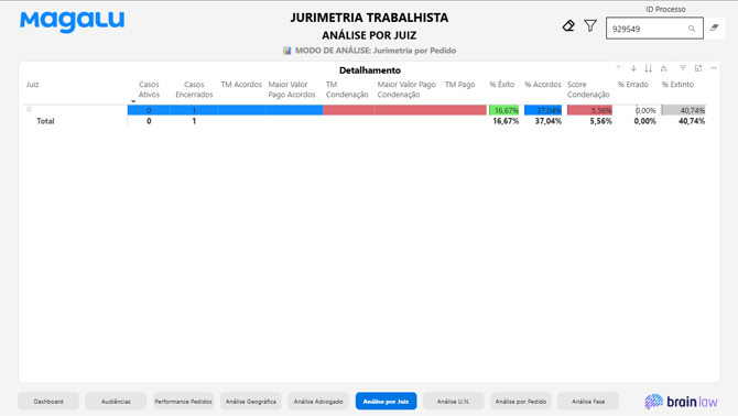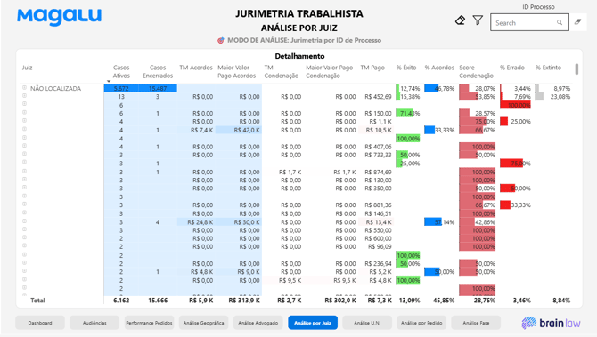 A análise por juiz mostra o histórico de decisões dos magistrados que julgaram processos da empresa. Com base nos percentuais de êxito, acordo e condenação, além dos valores médios e do Score de Condenação, é possível ajustar estratégias de defesa conforme o perfil de cada juiz.
