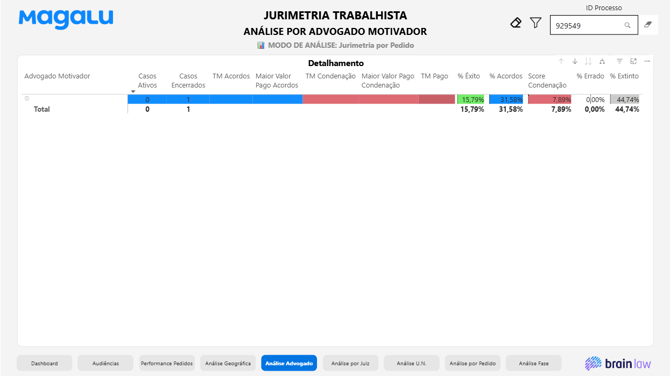 Quando nenhum ID de processo está selecionado, o dashboard apresenta a análise por ID de Processo. Nessa visualização, os dados são agrupados por processo, considera o histórico completo dos processos com características semelhantes, apresentando os resultados consolidados nas categorias de êxito, acordo, condenação, errado e extinto.