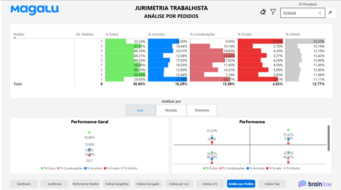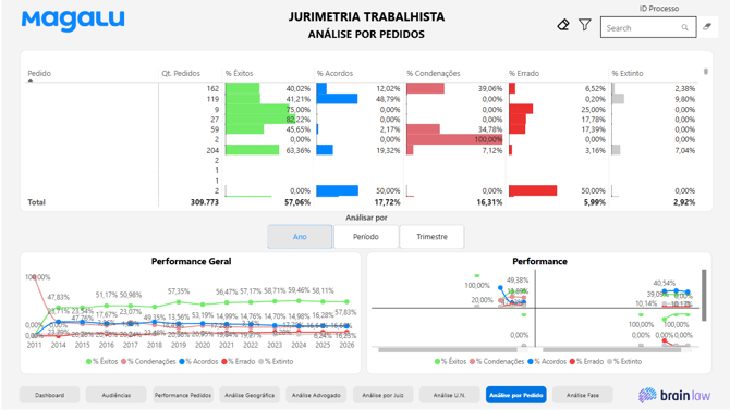 A tela de Análise por Pedido exibe o desempenho de cada tipo de pedido trabalhista, com percentuais de êxitos, acordos, condenações e processos extintos, além de gráficos de evolução histórica. Essa análise permite identificar pedidos mais críticos, forças defensivas e tendências ao longo do tempo.
