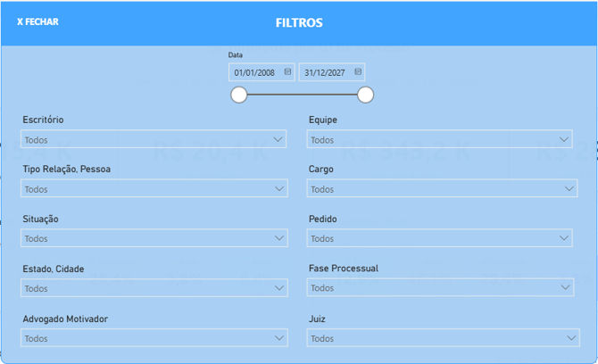 Em todas as telas, exceto Audiências, é possível filtrar os processos listados por: