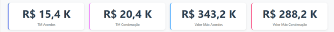 No topo do dashboard são apresentados quatro cards com os principais indicadores financeiros. Esses cards exibem o Ticket Médio de acordos, o Ticket Médio de condenações, o maior valor pago em um acordo e o maior valor pago em uma condenação.