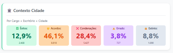 Tanto no Contexto Macro quanto no Contexto Cidade, você verá cinco categorias principais de resultados, sendo que o Score de condenação se baseia na categoria Condenações: