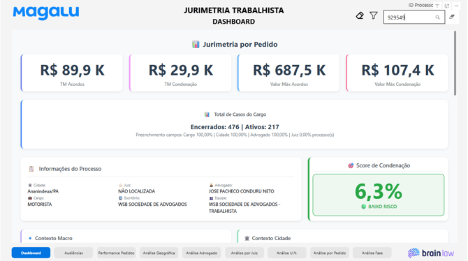 O dashboard utiliza uma lógica de análise em dois níveis. Quando nenhum ID de processo está selecionado, a análise é realizada no nível de Jurimetria por ID de Processo, apresentando uma visão geral dos processos. Quando um único ID de processo é selecionado, a análise passa a ser feita no nível de Jurimetria por Pedido, considerando pedidos com as mesmas características do processo filtrado.