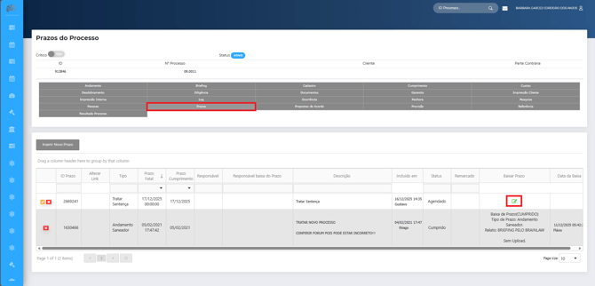 Entre na pasta do processo desejado dentro do Brainlaw e selecione a opção “Prazo”. Clique no ícone