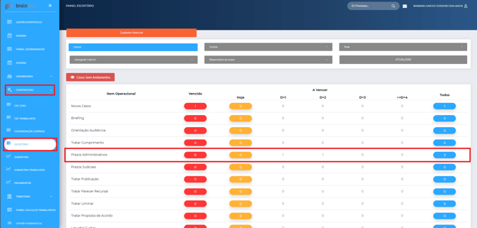 Menu lateral → Contencioso → Painel Escritório →Linha "Prazos Administrativos"