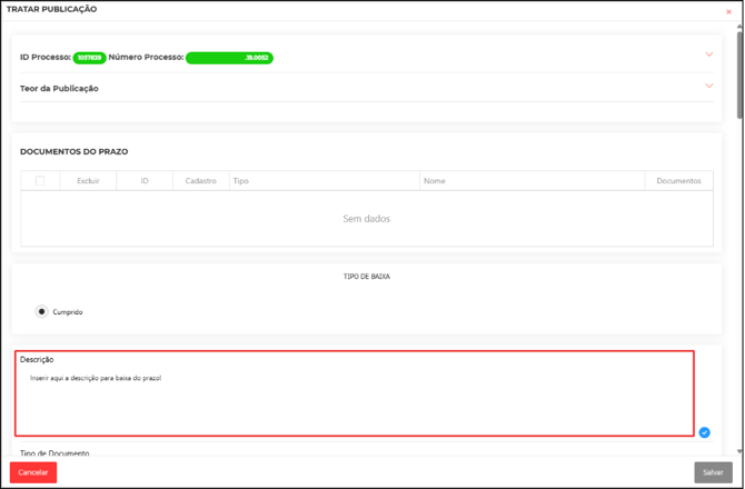 Inicie a baixa do prazo inserindo a descrição necessária.