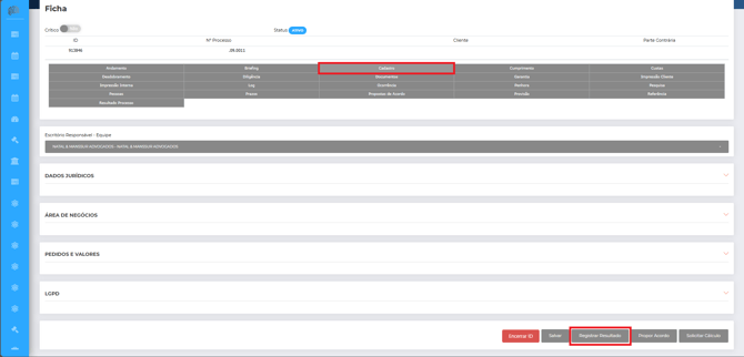 Entre na pasta do processo desejado dentro do Brainlaw e selecione a opção “Cadastro”. Clique no botão "Registrar Resultado":