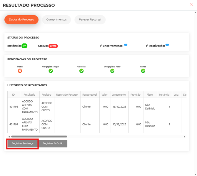 Clique em “Adicionar Resultado/Cumprimento/Parecer Recursal” e acesse a leitura da IA através do botão “Registrar Sentença”.
