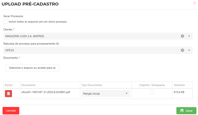 Em cliente, selecione a opção "Magazine" e natureza, selecione "Ofício".- Selecione o arquivo clicando no botão "Selecione o arquivo ou arraste para cá" ou arrastando na área de documento.