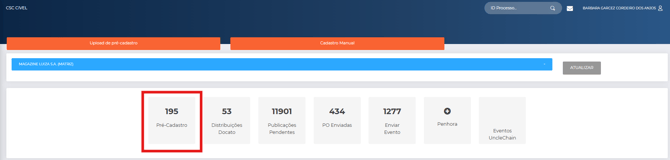 - Inicie o cadastro clicando em "Upload de pré-cadastro" no painel CSC Cível.