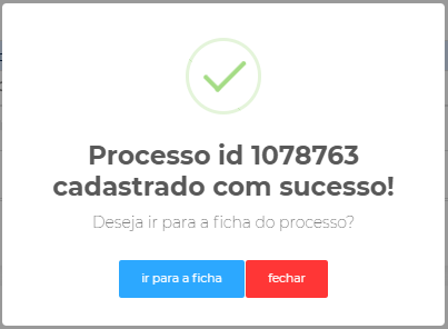 Será exibida mensagem de sucesso com as opções para acessar a ficha do processo recém cadastrado ou fechar.