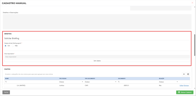 No cadastro do processo é possível solicitar Briefing, na opção: