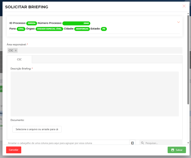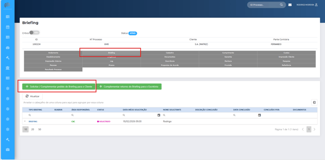 Dentro da ficha do processo, acessando a aba "Briefing" há a possibilidade de adicionar um novo briefing.