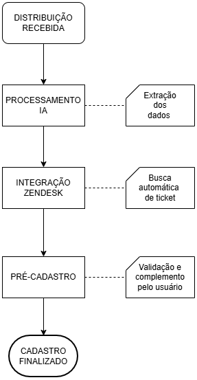 Após o retorno da IA, inicia-se o fluxo do Zendesk, alterando o status do processo para "AGUARDANDO PROCESSAMENTO ZENDESK".