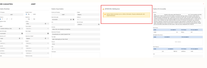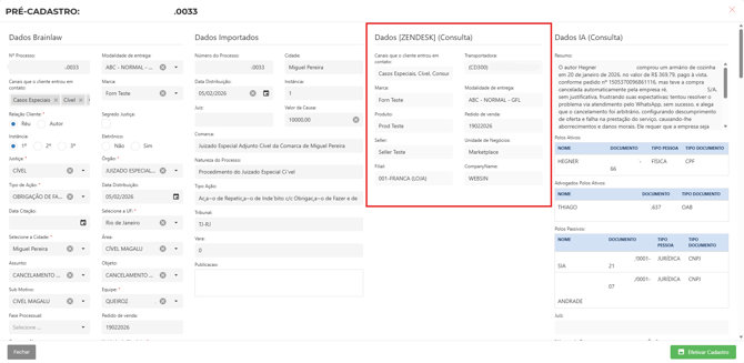 No formulário Dados Brainlaw os campos são preenchidos automaticamente com as informações retornadas do Zendesk