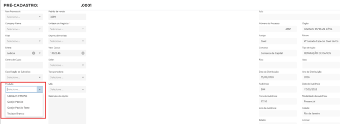 Campos do tipo lista serão preenchidos automaticamente quando encontrados valores relacionados. Em alguns casos, como do campo "Produto" por exemplo, se não for encontrado o valor correspondente o valor retornado será inserido na lista já existente.
