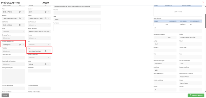 Para esse caso os campos do formulário Dados Brainlaw serão preenchidos com o retorno da IA.