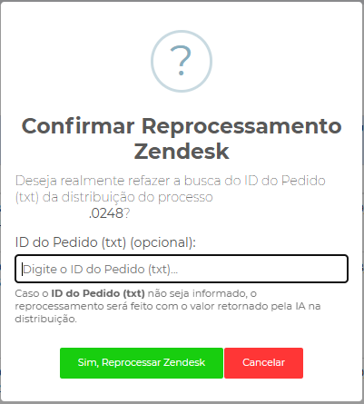 - Quando enviado para reprocessamento, o status é alterado para "REPROCESSAMENTO ZENDESK".