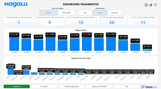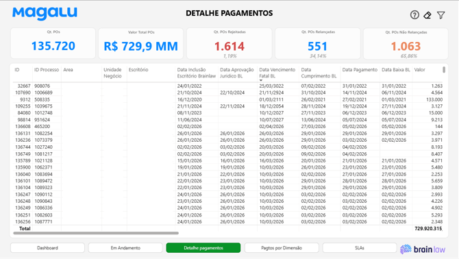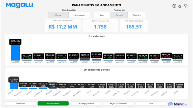 O Dashboard de Pagamentos Magalu foi desenvolvido para apoiar a gestão das POs (Ordens de Pagamento), permitindo análises tanto em nível macro quanto detalhado, por número de PO, período ou dimensão organizacional.