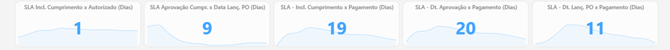 Os indicadores de SLA (Service Level Agreement) têm como objetivo monitorar e otimizar os principais prazos envolvidos no processo de cumprimento e pagamento das POs. Cada métrica foi definida para refletir o tempo médio entre etapas críticas do fluxo, permitindo uma visão clara da eficiência operacional e da fluidez dos processos internos.