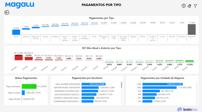 Na parte debaixo, é apresentada a distribuição dos pagamentos em andamento por tipo, como acordos, sentenças, condenações, recolhimentos e demais categorias jurídicas e administrativas, acompanhadas de seus valores totais e percentuais de participação.