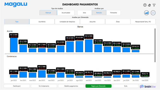 Nas abas Dashboard, Em andamento e Pagamentos por dimensão é possível visualizar os dados por "Tipo de Análise" e "Analisar por".