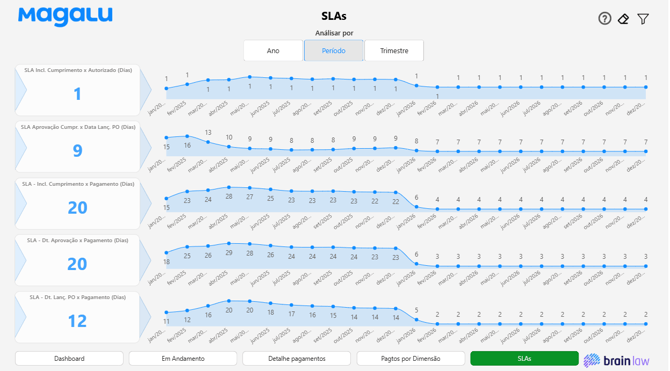Na tela inicial temos visões de SLA e aos montantes de pagamentos organizados por ano, período ou trimestre. As informações podem ser analisadas de forma mensal ou acumulada, permitindo acompanhar a evolução dos valores ao longo do tempo. Os gráficos apresentam indicadores de diferença percentual entre os dados atuais e os do período anterior.