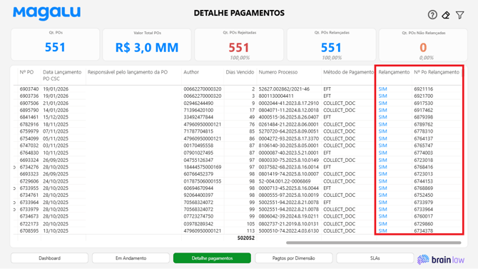 Com os filtros de PO Rejeitada e Relançamento de PO Rejeitada, é possível analisar as ordens de pagamento que foram rejeitadas, identificar se houve relançamento e, quando aplicável, visualizar o número da nova PO vinculada ao relançamento.