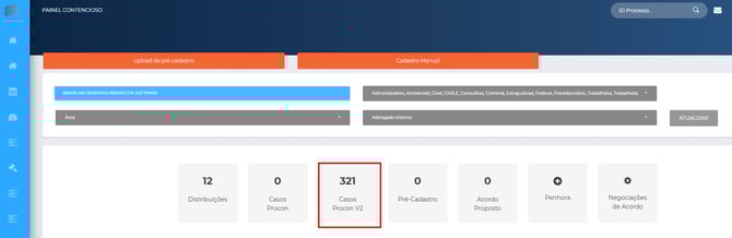 Painel Contencioso → Selecione o cliente → Justiça → Box “Casos Procon V2”