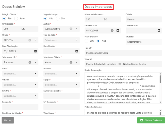Verifique sempre os dados exibidos na coluna Dados Importados para garantir que as informações capturadas estejam corretas antes de efetivar o cadastro.