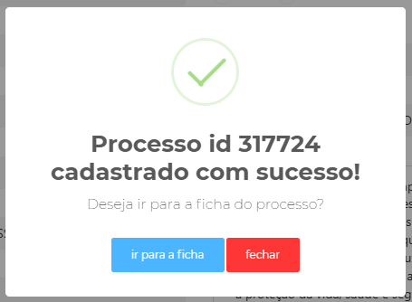 Ao efetivar, abrirá a mensagem de sucesso no cadastro com as opções para acessar a ficha do processo ou fechar.