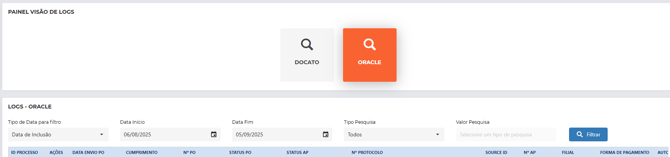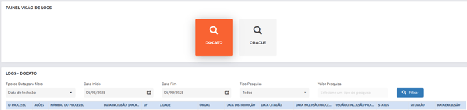 A tela de logs de parceiros é um painel de controle que permite consultar e analisar os registros de integração entre o Brainlaw e diferentes parceiros, como Docato e Oracle.
