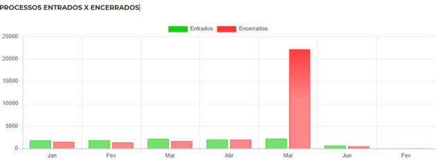 É um painel útil para entender o fluxo da operação jurídica, evidenciar mutirões, sobrecargas ou períodos de baixa.