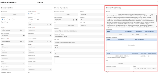 - Ao prosseguir com o novo cadastro, os dados identificados serão preenchidos e disponibilizados na lateral direita, na coluna "DADOS IA (Consulta)", conforme imagem abaixo.