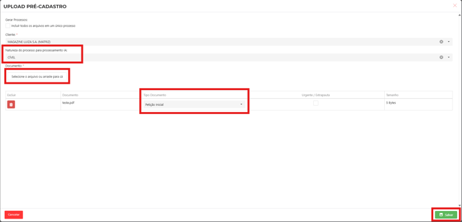 Menu lateral → Contencioso → CSC Cível → Upload de pré-cadastro