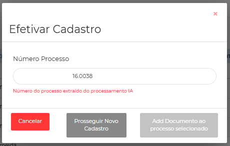 - Caso o número do processo seja identificado pela IA, será exibida a mensagem de extração pela IA e o campo preenchido.